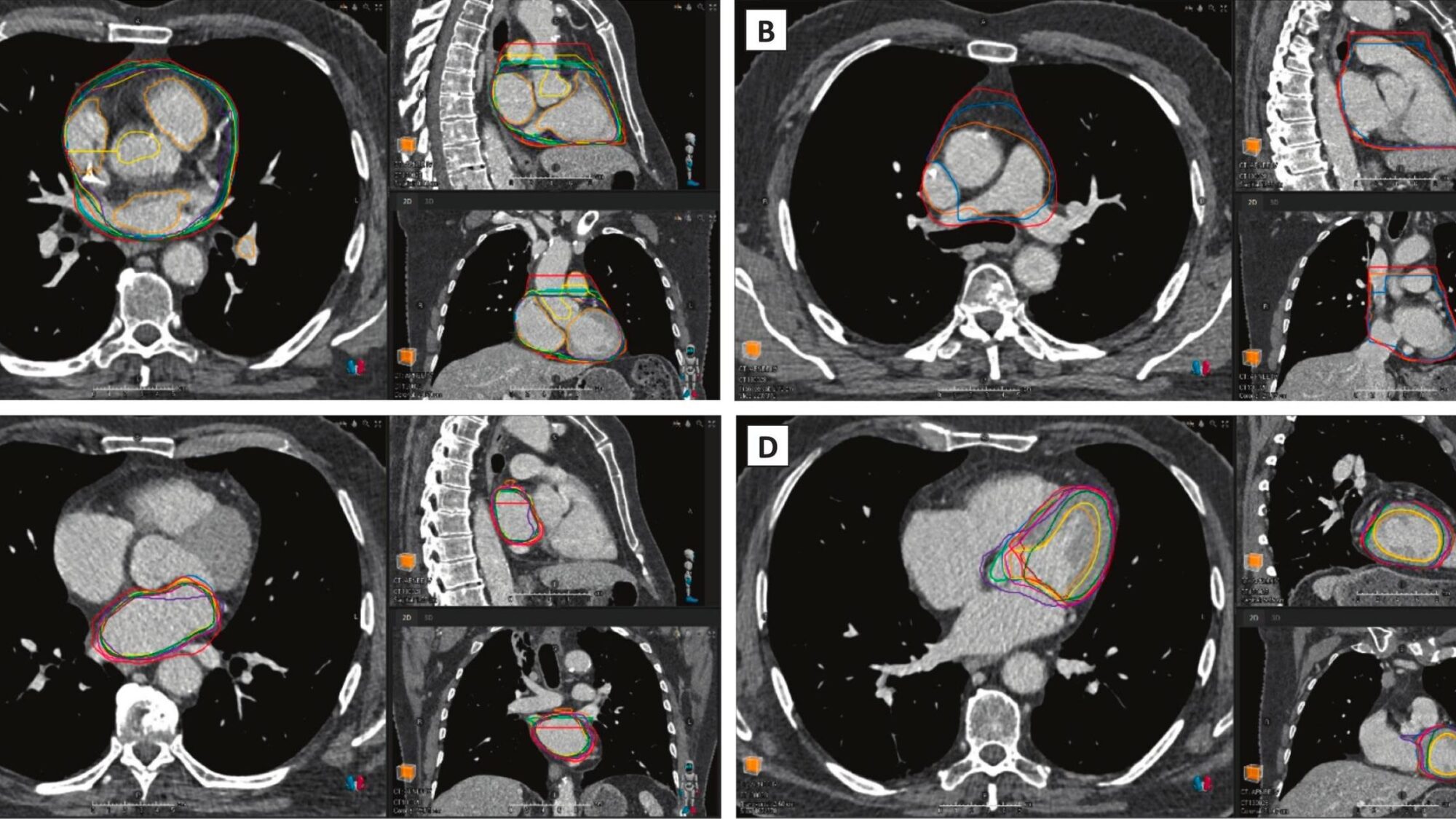 Figure 1. Illustration des différences sur les règles de contouring adoptées selon la solution de contouring par intelligence artificielle (A = Cœur, B = Heart_APulm, C = Atrium_L, D = Ventricle_L). © 2026 The Authors. Published by Elsevier B.V. on behalf of European Society of Radiotherapy & Oncology.